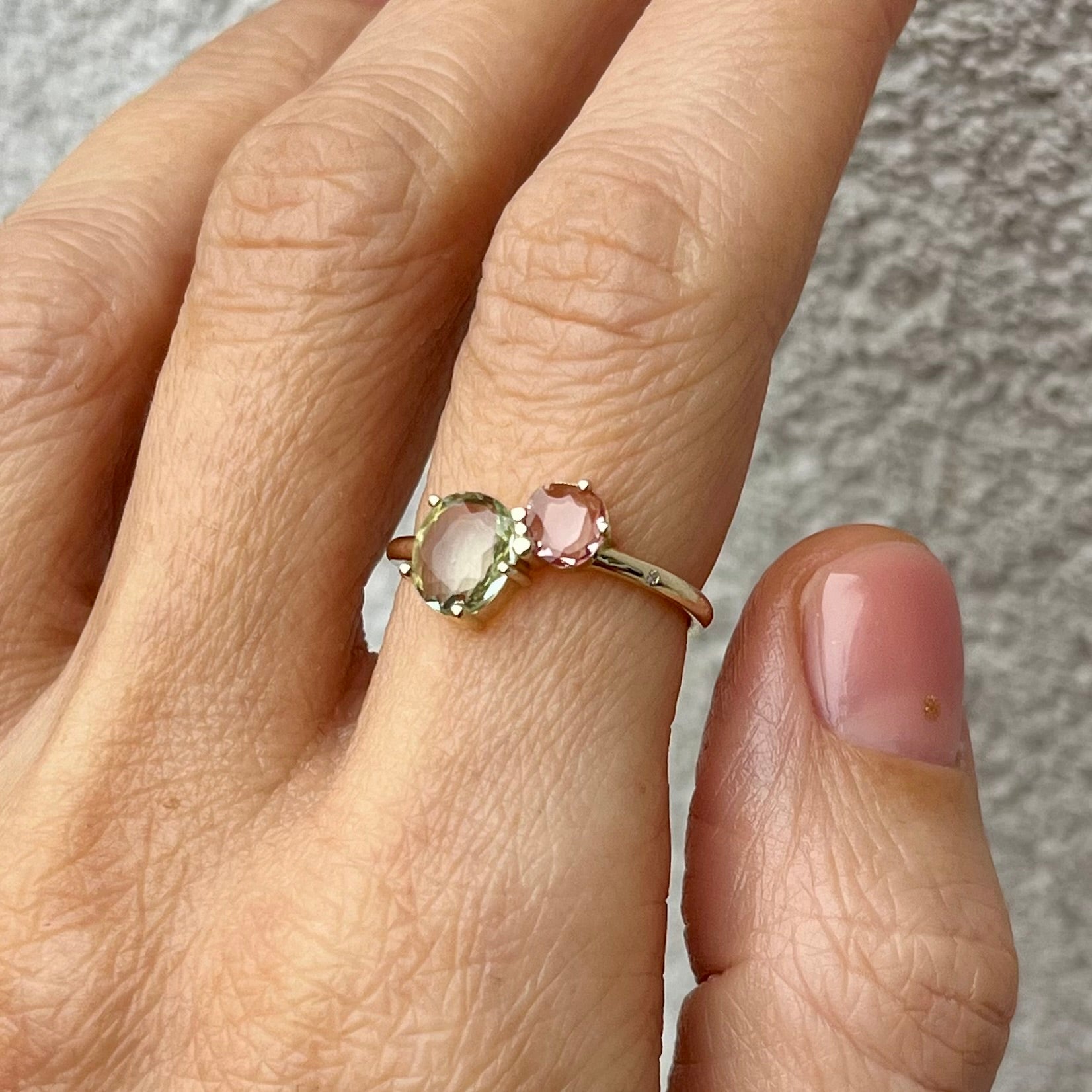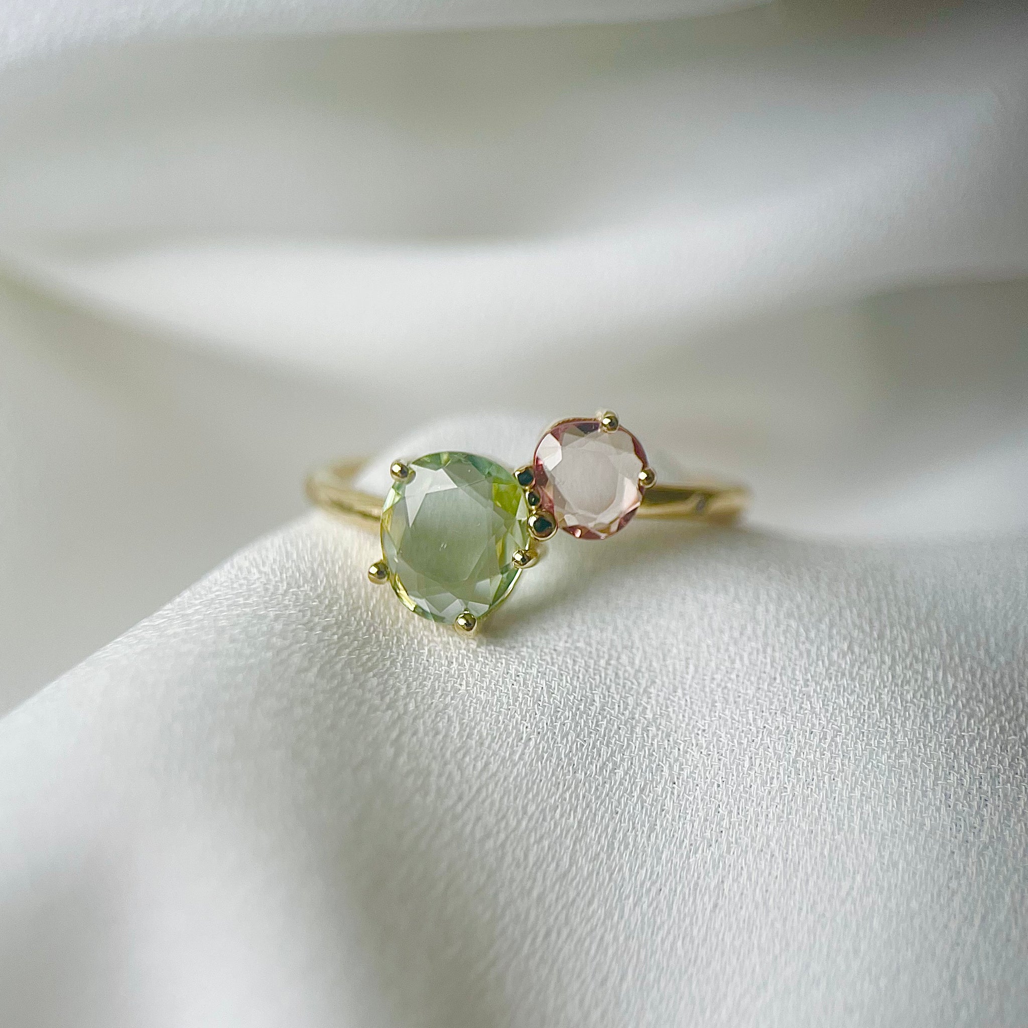 14 karátos sárga arany és egy zöld, illetve rózsaszín gránát gyönyörű találkozása.