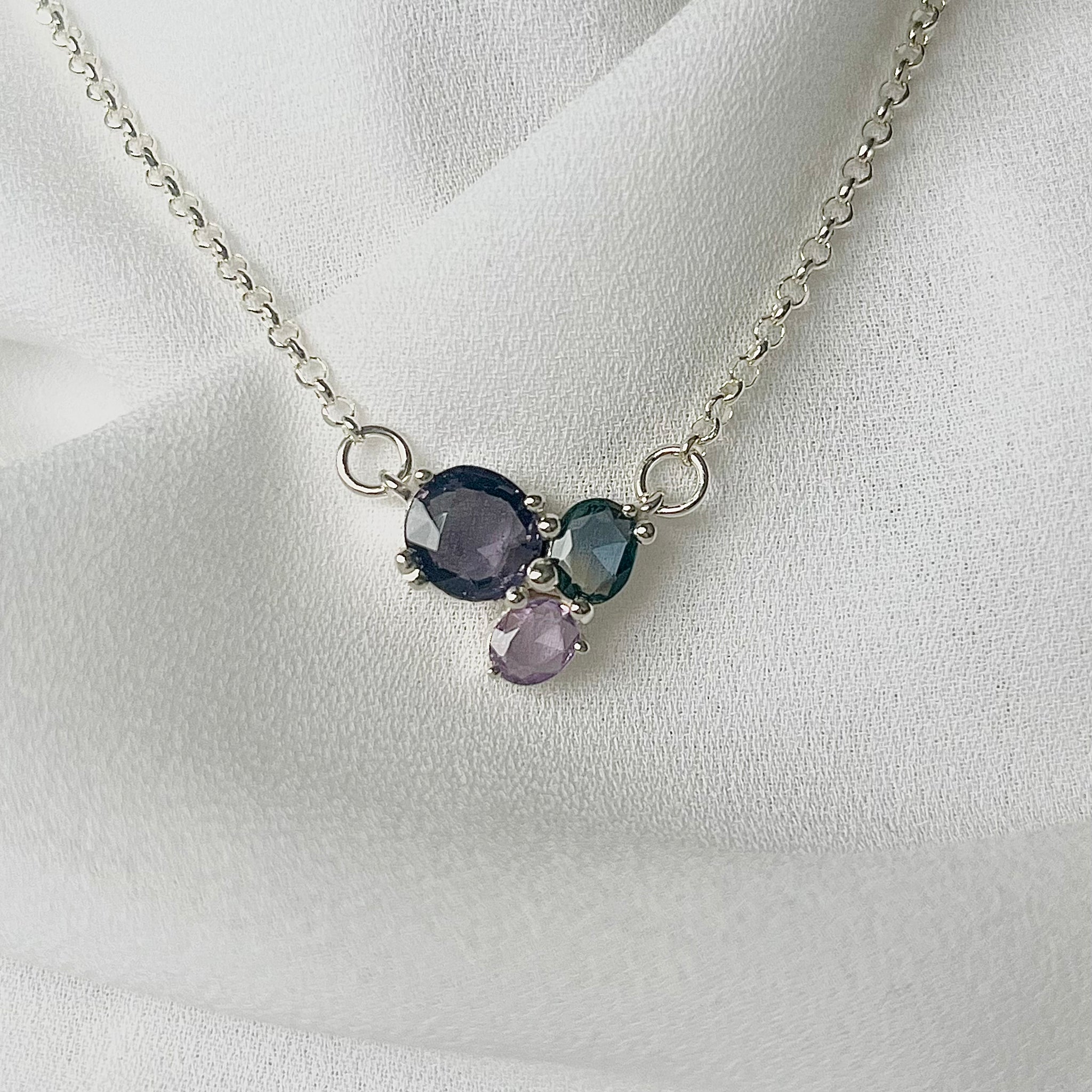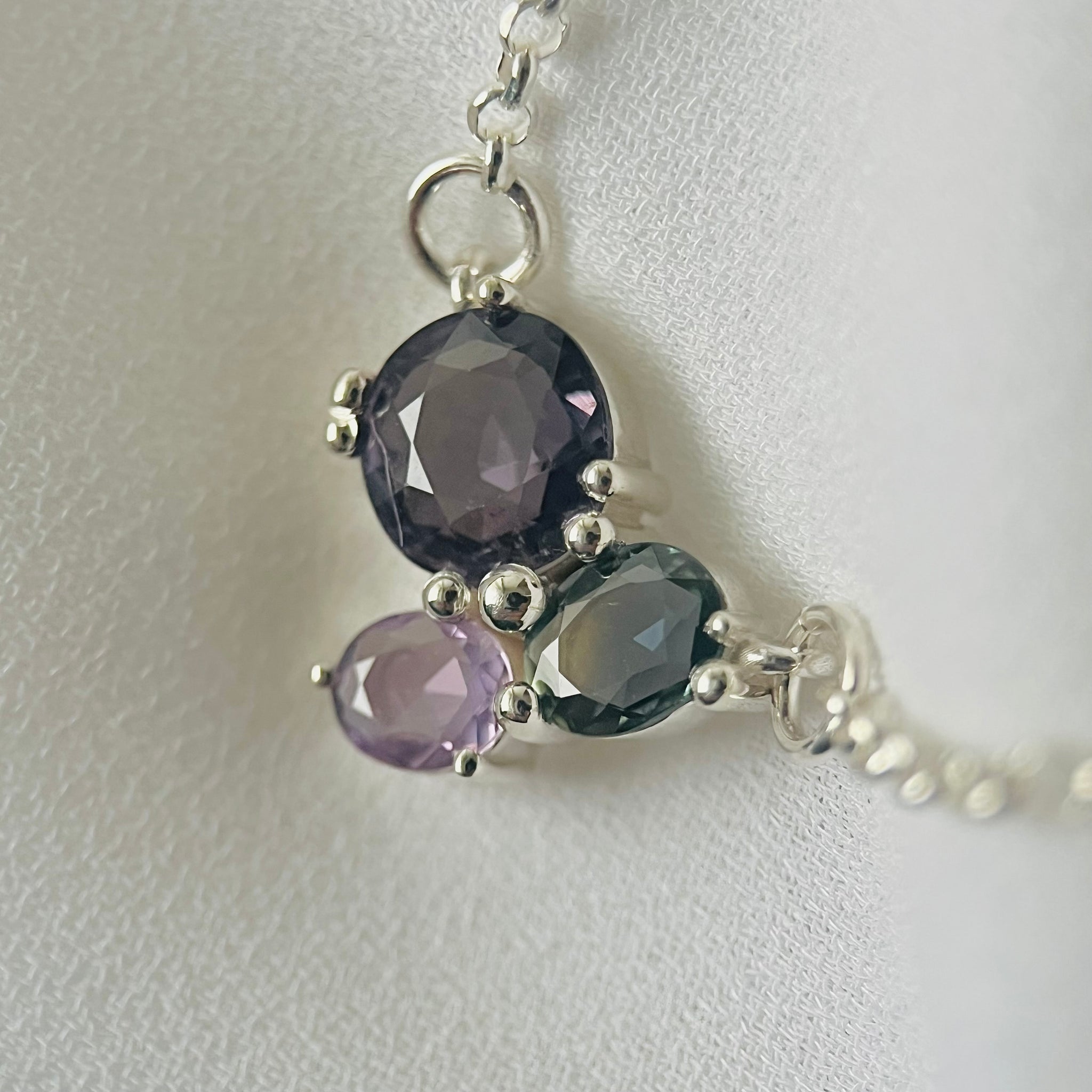 925 Sterling ezüst és free form csiszolású sötét & halványlila & bicolor kékből zöldbe váltó zafírok találkozása.
